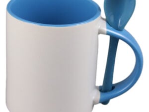 Cana ceramica sublimabila, cu interior si lingurita albastru deschis, 300 ml