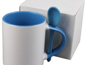 Cana ceramica sublimabila, cu interior si lingurita albastru deschis, 300 ml, cu cutie individuala