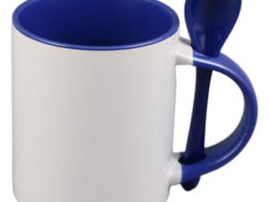 Cana ceramica sublimabila, cu interior si lingurita albastre, 300 ml