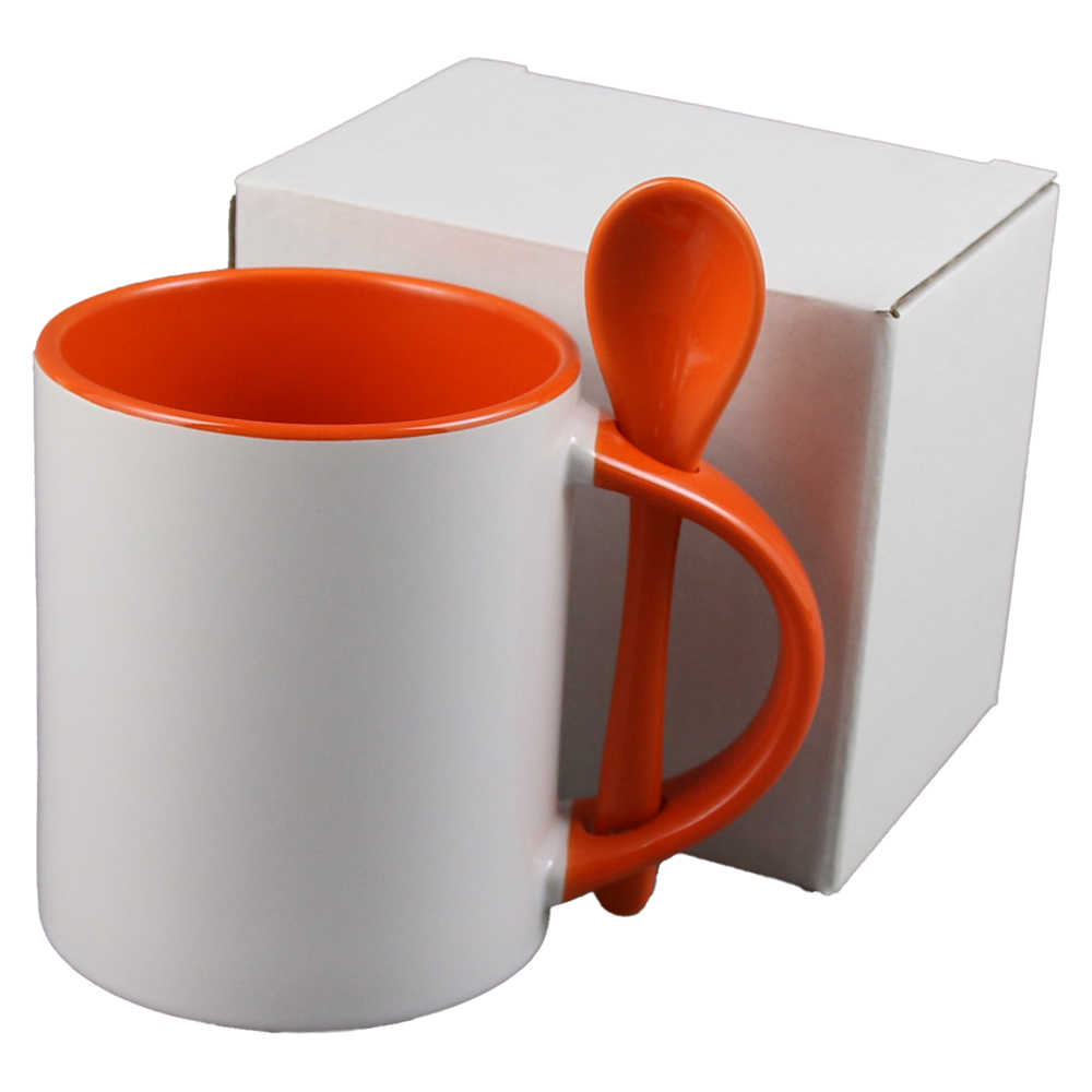 Cana ceramica cu lingurita, portocaliu, 300 ml, sublimabila + cutie individuala