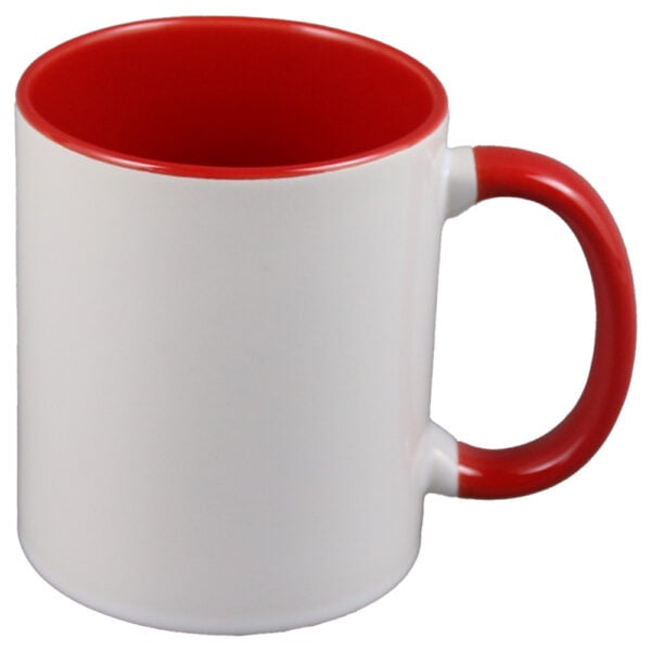 Cana cu interior colorat si toarta colorata. Printul se face pe hartia de sublimare in oglinda. Printul se lipeste pe cana cu ajutorul benzii adezive termorezistenta. (Este recomandat sa fie canile caldute cand se lipeste printul). Cu presa termica pentru