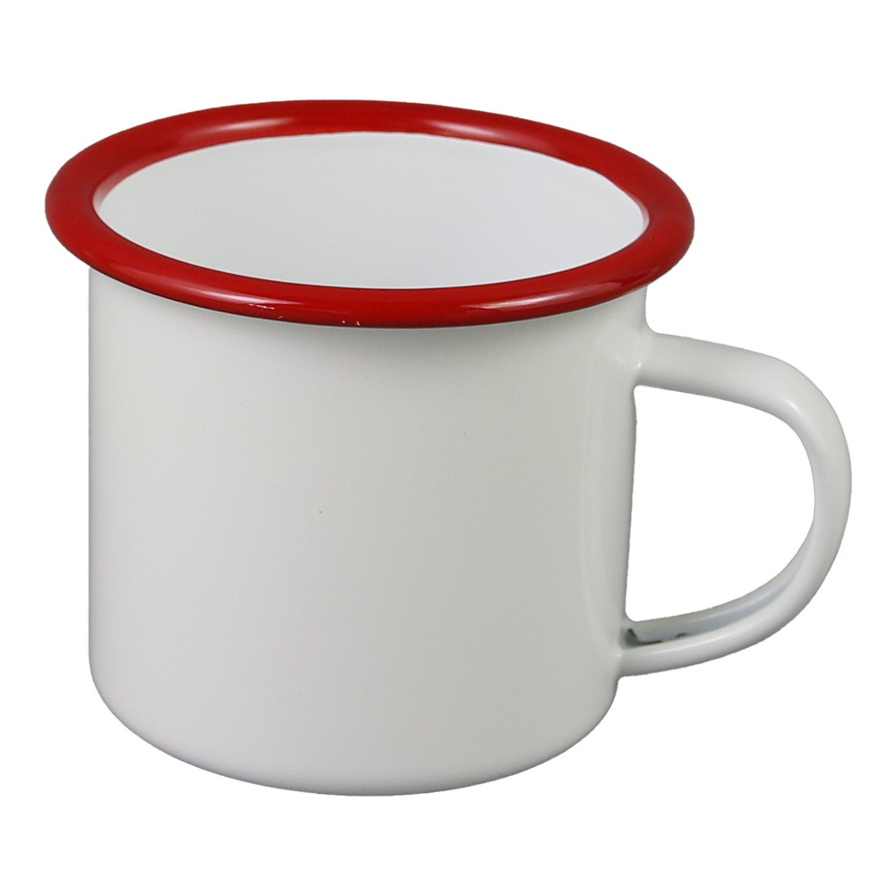 Cana emailata alba, retro, cu margine rosie, 240 ml, sublimabila